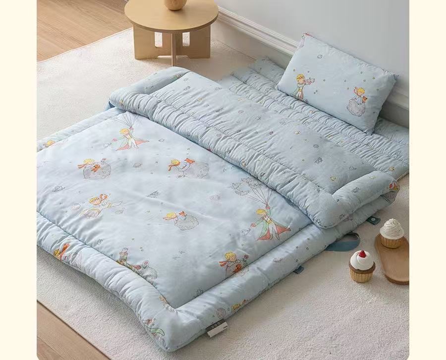 A soft and cozy kids nap mat bedding set inspired by the classic Little Prince illustrations. The set features charming storybook prints of the little prince, stars, and playful elements on a gentle pastel background, creating a dreamy and comforting atmosphere for children.