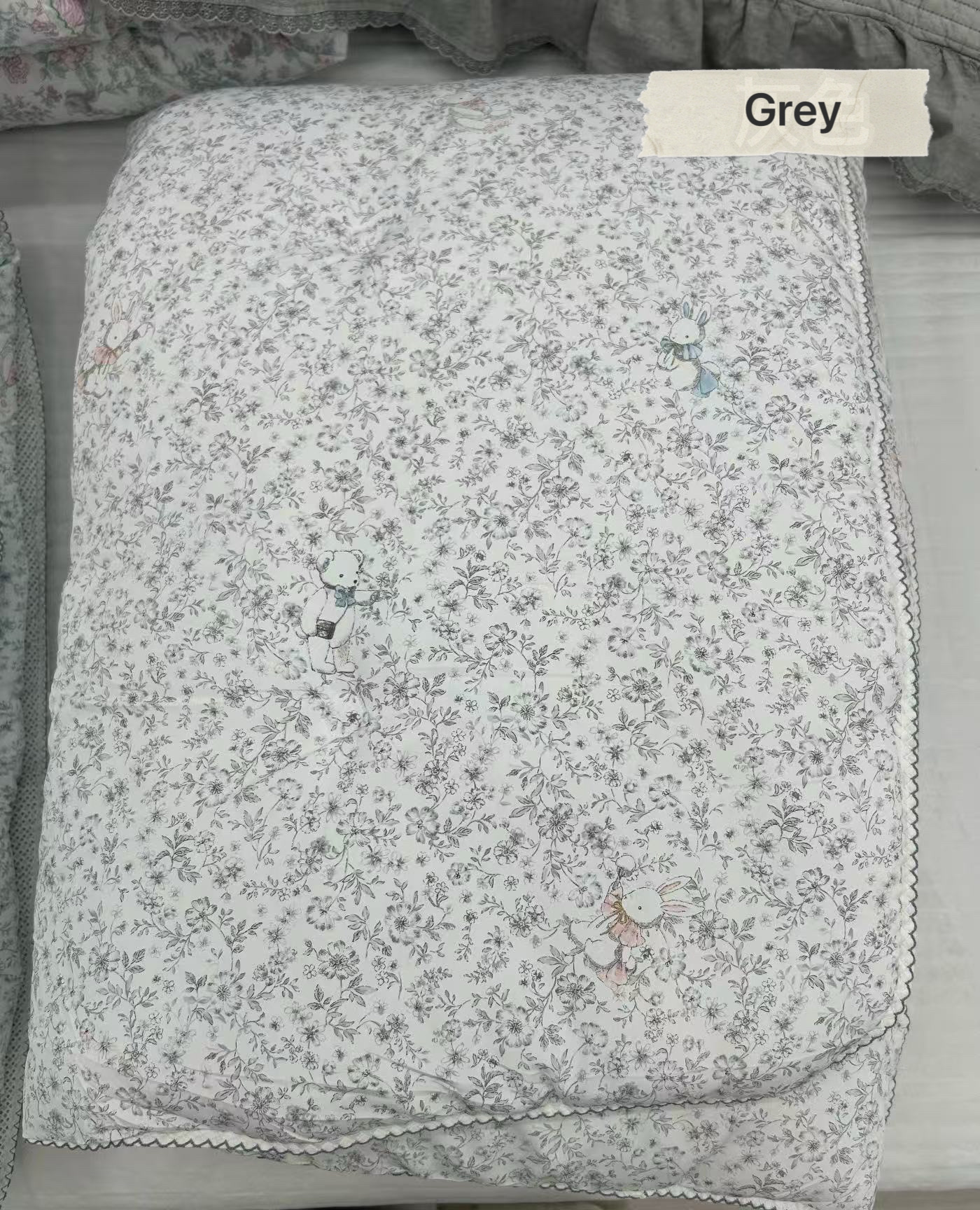A soft and lightweight four-season blanket featuring delicate floral prints with bunny illustrations scattered across a clean white background. The design combines tiny botanical patterns , creating a cozy and elegant bedroom look with a touch of sweetness.